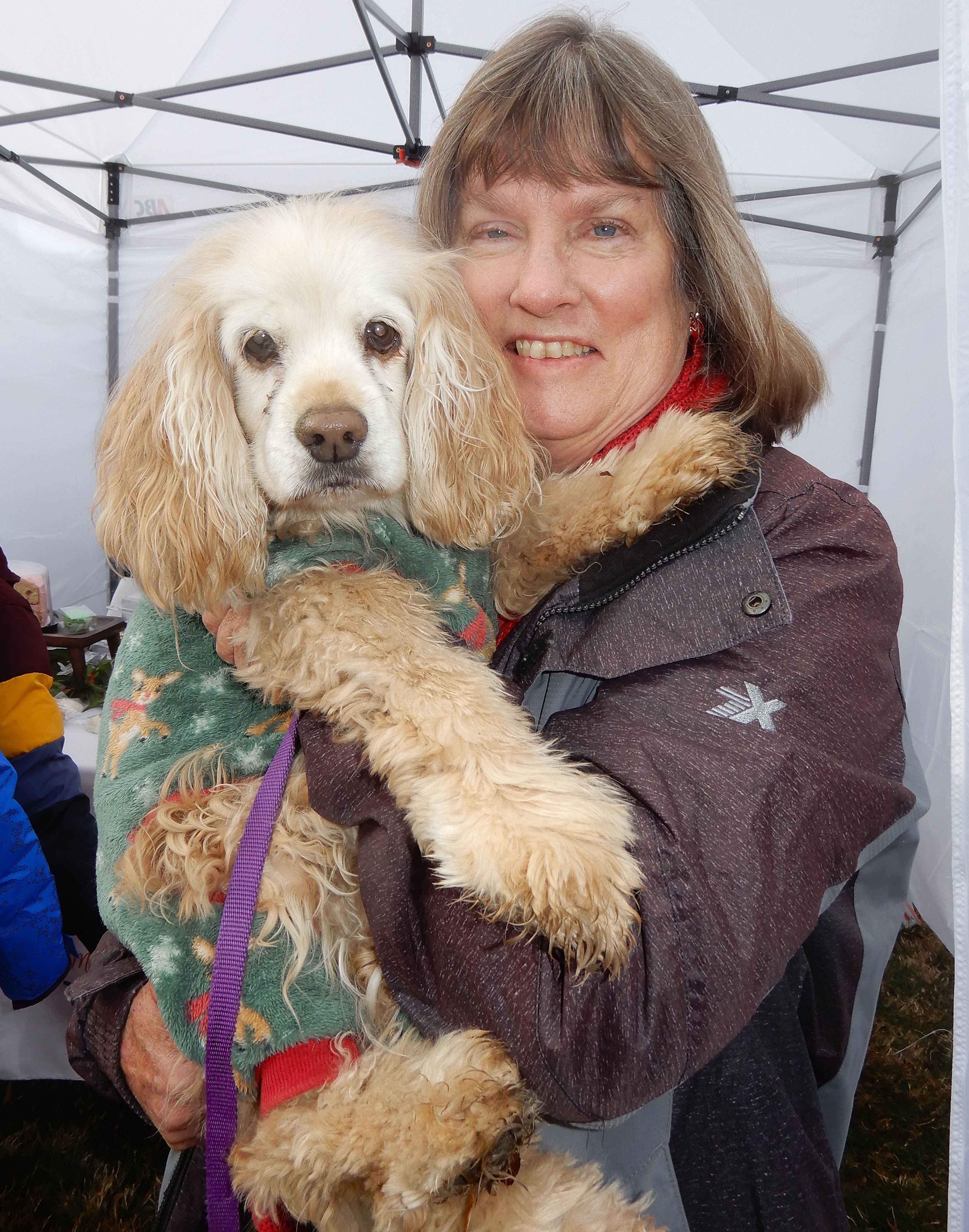Hope Britt and her cocker spaniel, Holly, 15, dressed in her Christmas pajamas on her way to see Santa.