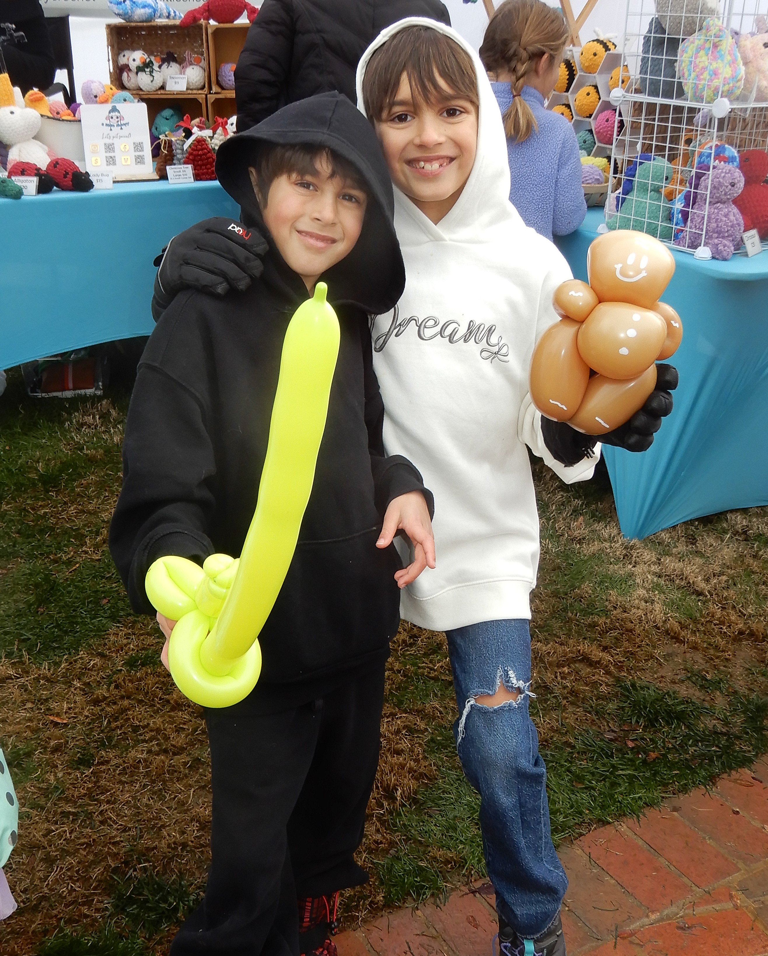 From left, brothers Guillaume Girard, 7, and Raphael Tasneem, 9, pose with their balloon sword and gingerbread man.