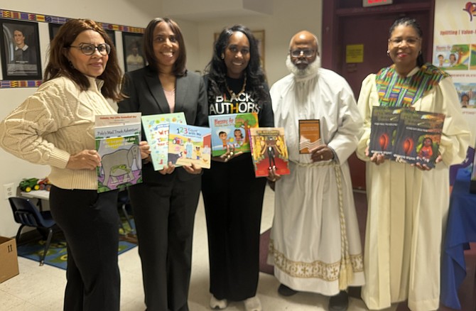 CELEBRATING BLACK AUTHORS - Deacon Tim Tilghman, second from right, poses with authors CoCo Labo, Valarie Johnson, Elena Neely and Melanie Glynn as part of the Coffee With Local Black Authors Feb. 15 at St. Joseph’s Catholic Church in Old Town. The event was co-sponsored by the church and the Concerned Citizens Network of Alexandria in celebration of Black History Month. www.ccnalexandria.org